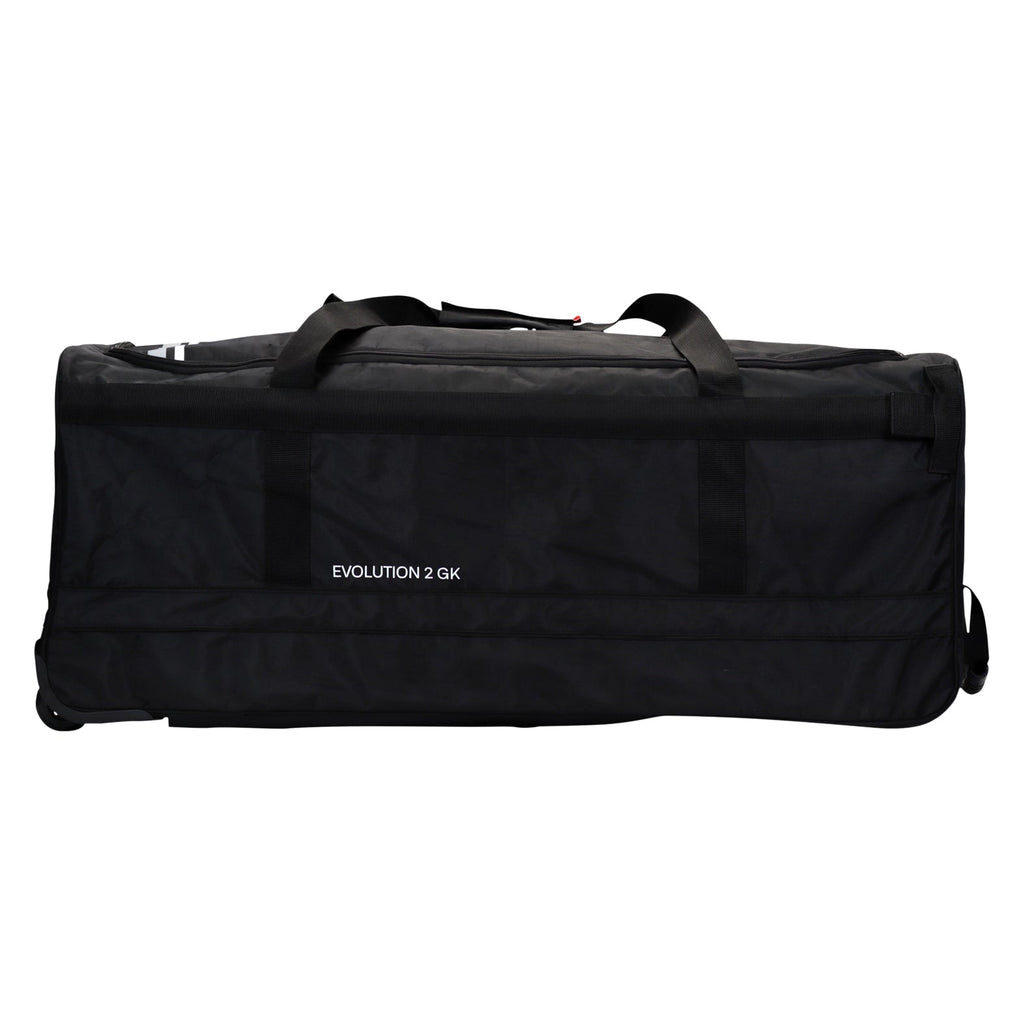 Brand new look for the stand-up Goalie Gear bag. The Evolution Two has side struts and an internal structure that means it can stand-up on it's end, minimising contact with the floor. Heavy duty wheels and a soft pulling handle complete the outer features with internal pockets and large capacity completing the spec.